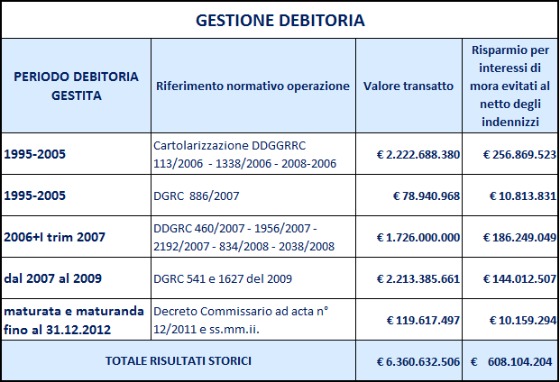 Si riportano di seguito il riepilogo delle operazioni di risanamento del debito maturato dal Sistema Sanitario Campano nel corso del tempo realizzate attraverso So.Re.Sa.